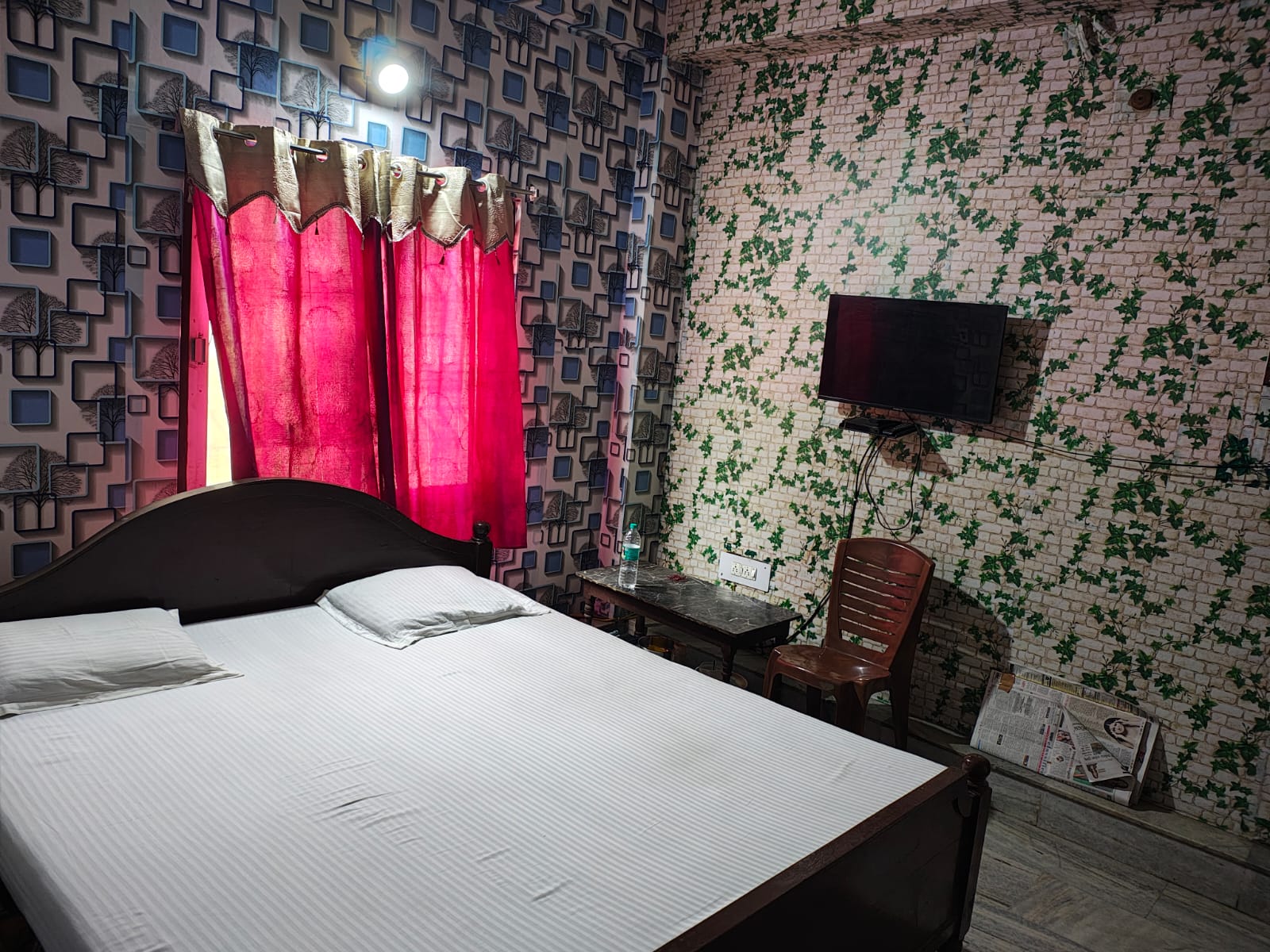 Non AC Single Room with attached bathroom including chair, table and TV.